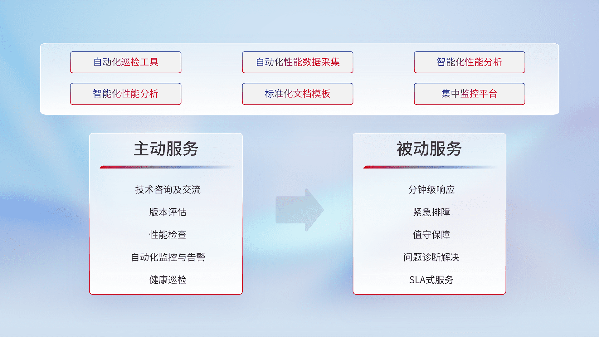 智能化工具和标准化文档,,,,保障服务质量,,,,提供主动服务(包含技术咨询、、、、版本评估、、、性能检查、、、自动化监控与告警、、、健康巡检)和被动服务包含(分钟级响应、、、、紧急排障、、、值守保障、、、问题诊断解决、、、SLA服务)。。。